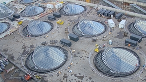 Im Hintergrund alle Lichtaugen, Gitterschalen Südeingang und SK24. Beim Turm entsteht der Wetterschutz für den Bau der Gitterschale Mitteleingang.